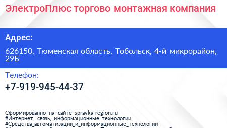 ЭлектроПлюс, торгово-монтажная компания по адресу 626150, Тюменская область, Тобольск, 4-й микрорайон, 29Б в дальнейшем Организация, размещена в следующих категориях: