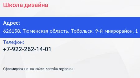 Школа дизайна по адресу 626158, Тюменская область, Тобольск, 9-й микрорайон, 1 в дальнейшем Организация, размещена в следующих категориях: