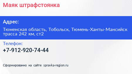 Маяк, штрафстоянка по адресу Тюменская область, Тобольск, Тюмень-Ханты-Мансийск трасса 242 км, ст2 в дальнейшем Организация, размещена в следующих категориях: