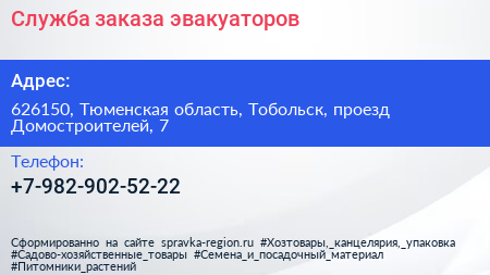 Служба заказа эвакуаторов по адресу 626150, Тюменская область, Тобольск, проезд Домостроителей, 7 в дальнейшем Организация, размещена в следующих категориях: