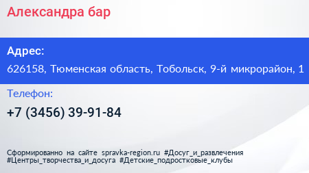 Александра, бар по адресу 626158, Тюменская область, Тобольск, 9-й микрорайон, 1 в дальнейшем Организация, размещена в следующих категориях: