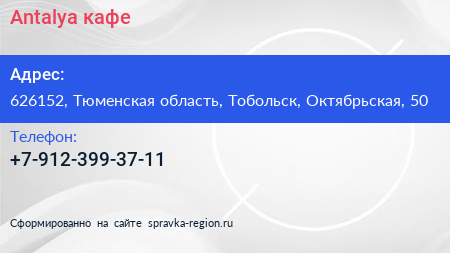 Antalya, кафе по адресу 626152, Тюменская область, Тобольск, Октябрьская, 50 в дальнейшем Организация, размещена в следующих категориях: