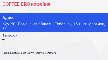 COFFEE BRO, кофейня по адресу 626150, Тюменская область, Тобольск, 15-й микрорайон, 37 в дальнейшем Организация, размещена в следующих категориях: