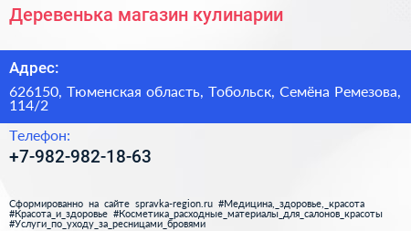 Деревенька, магазин кулинарии по адресу 626150, Тюменская область, Тобольск, Семёна Ремезова, 114/2 в дальнейшем Организация, размещена в следующих категориях: