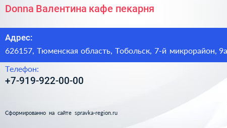 Donna Валентина, кафе-пекарня по адресу 626157, Тюменская область, Тобольск, 7-й микрорайон, 9а в дальнейшем Организация, размещена в следующих категориях: