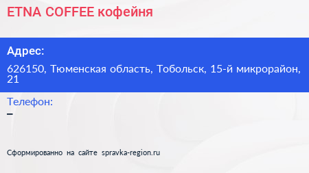 ETNA COFFEE, кофейня по адресу 626150, Тюменская область, Тобольск, 15-й микрорайон, 21 в дальнейшем Организация, размещена в следующих категориях: