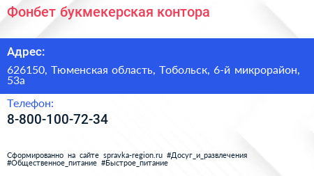 Фонбет, букмекерская контора по адресу 626150, Тюменская область, Тобольск, 6-й микрорайон, 53а в дальнейшем Организация, размещена в следующих категориях: