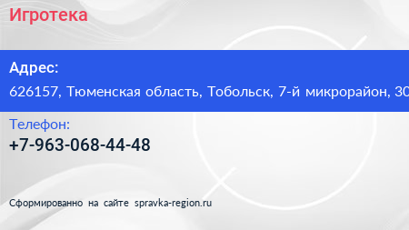 Игротека по адресу 626157, Тюменская область, Тобольск, 7-й микрорайон, 30 в дальнейшем Организация, размещена в следующих категориях:
