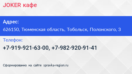 JOKER, кафе по адресу 626150, Тюменская область, Тобольск, Полонского, 3 в дальнейшем Организация, размещена в следующих категориях: