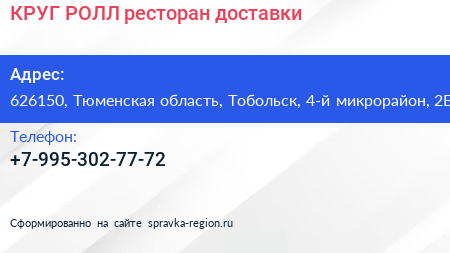 КРУГ & РОЛЛ, ресторан доставки по адресу 626150, Тюменская область, Тобольск, 4-й микрорайон, 2Б в дальнейшем Организация, размещена в следующих категориях: