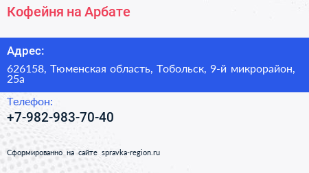 Кофейня на Арбате по адресу 626158, Тюменская область, Тобольск, 9-й микрорайон, 25а в дальнейшем Организация, размещена в следующих категориях:
