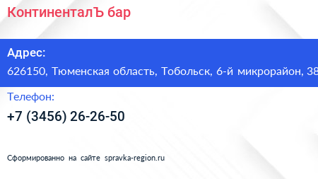 КонтиненталЪ, бар по адресу 626150, Тюменская область, Тобольск, 6-й микрорайон, 38 в дальнейшем Организация, размещена в следующих категориях: