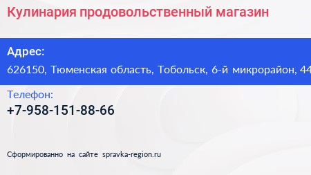 Кулинария, продовольственный магазин по адресу 626150, Тюменская область, Тобольск, 6-й микрорайон, 44 в дальнейшем Организация, размещена в следующих категориях: