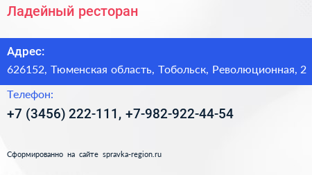 Ладейный, ресторан по адресу 626152, Тюменская область, Тобольск, Революционная, 2 в дальнейшем Организация, размещена в следующих категориях: