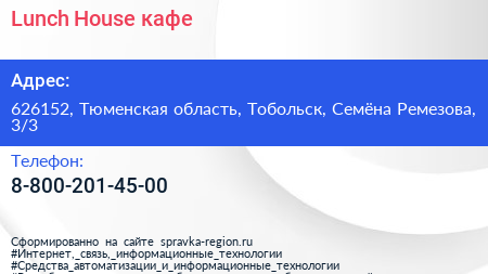 Lunch House, кафе по адресу 626152, Тюменская область, Тобольск, Семёна Ремезова, 3/3 в дальнейшем Организация, размещена в следующих категориях: