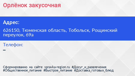 Орлёнок, закусочная по адресу 626150, Тюменская область, Тобольск, Рощинский переулок, 69а в дальнейшем Организация, размещена в следующих категориях:
