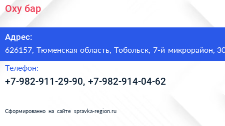 Oxy, бар по адресу 626157, Тюменская область, Тобольск, 7-й микрорайон, 30 в дальнейшем Организация, размещена в следующих категориях:
