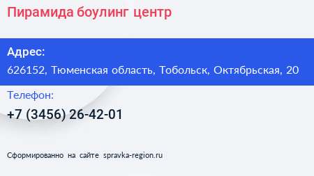 Пирамида, боулинг-центр по адресу 626152, Тюменская область, Тобольск, Октябрьская, 20 в дальнейшем Организация, размещена в следующих категориях:
