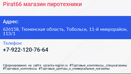 Pirat66, магазин пиротехники по адресу 626158, Тюменская область, Тобольск, 11-й микрорайон, 113/1 в дальнейшем Организация, размещена в следующих категориях: