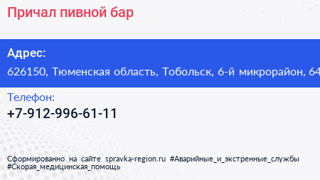 Причал, пивной бар по адресу 626150, Тюменская область, Тобольск, 6-й микрорайон, 64 в дальнейшем Организация, размещена в следующих категориях: