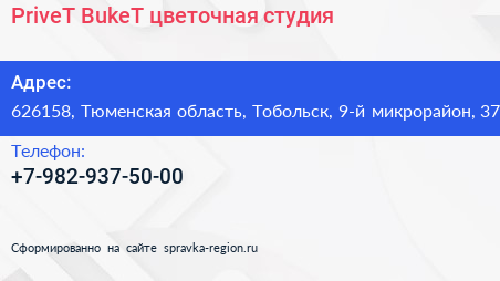 PriveT BukeT, цветочная студия по адресу 626158, Тюменская область, Тобольск, 9-й микрорайон, 37 в дальнейшем Организация, размещена в следующих категориях: