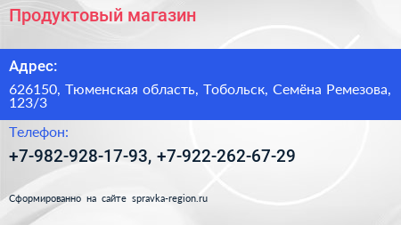 Продуктовый магазин по адресу 626150, Тюменская область, Тобольск, Семёна Ремезова, 123/3 в дальнейшем Организация, размещена в следующих категориях: