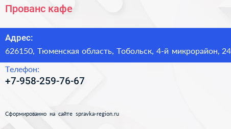 Прованс, кафе по адресу 626150, Тюменская область, Тобольск, 4-й микрорайон, 24 в дальнейшем Организация, размещена в следующих категориях: