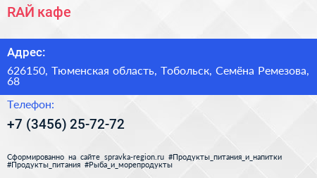 RАЙ, кафе по адресу 626150, Тюменская область, Тобольск, Семёна Ремезова, 68 в дальнейшем Организация, размещена в следующих категориях: