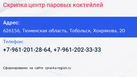 Скрипка, центр паровых коктейлей по адресу 626156, Тюменская область, Тобольск, Хохрякова, 20 в дальнейшем Организация, размещена в следующих категориях:
