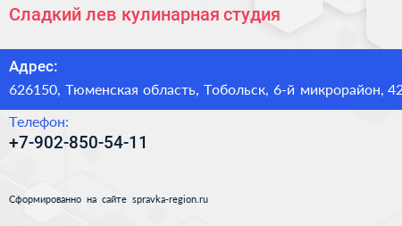 Сладкий лев, кулинарная студия по адресу 626150, Тюменская область, Тобольск, 6-й микрорайон, 42 в дальнейшем Организация, размещена в следующих категориях: