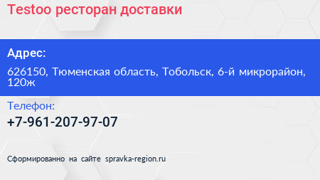 Testoo, ресторан доставки по адресу 626150, Тюменская область, Тобольск, 6-й микрорайон, 120ж в дальнейшем Организация, размещена в следующих категориях: