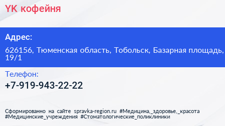 YK, кофейня по адресу 626156, Тюменская область, Тобольск, Базарная площадь, 19/1 в дальнейшем Организация, размещена в следующих категориях: