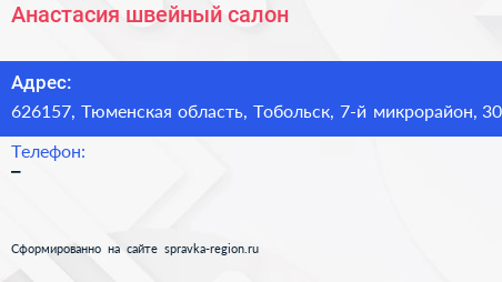 Анастасия, швейный салон по адресу 626157, Тюменская область, Тобольск, 7-й микрорайон, 30 в дальнейшем Организация, размещена в следующих категориях: