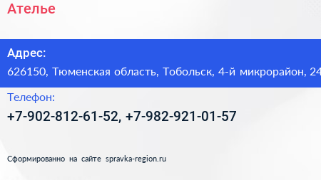 Ателье по адресу 626150, Тюменская область, Тобольск, 4-й микрорайон, 24 в дальнейшем Организация, размещена в следующих категориях: