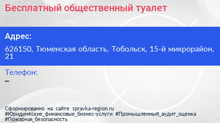 Бесплатный общественный туалет по адресу 626150, Тюменская область, Тобольск, 15-й микрорайон, 21 в дальнейшем Организация, размещена в следующих категориях: