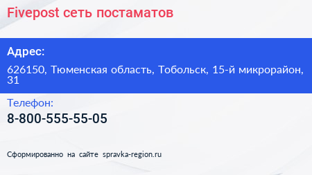 Fivepost, сеть постаматов по адресу 626150, Тюменская область, Тобольск, 15-й микрорайон, 31 в дальнейшем Организация, размещена в следующих категориях: