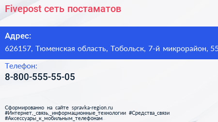Fivepost, сеть постаматов по адресу 626157, Тюменская область, Тобольск, 7-й микрорайон, 55 в дальнейшем Организация, размещена в следующих категориях: