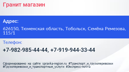 Гранит, магазин по адресу 626150, Тюменская область, Тобольск, Семёна Ремезова, 115/1 в дальнейшем Организация, размещена в следующих категориях: