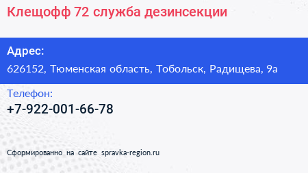 Клещофф 72, служба дезинсекции по адресу 626152, Тюменская область, Тобольск, Радищева, 9а в дальнейшем Организация, размещена в следующих категориях: