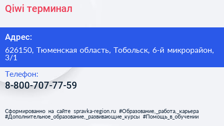 Qiwi, терминал по адресу 626150, Тюменская область, Тобольск, 6-й микрорайон, 3/1 в дальнейшем Организация, размещена в следующих категориях: