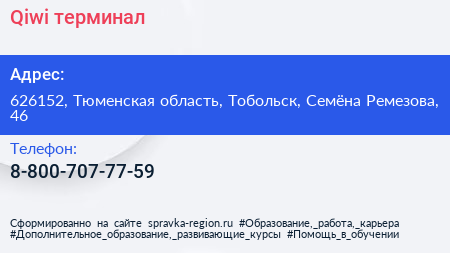 Qiwi, терминал по адресу 626152, Тюменская область, Тобольск, Семёна Ремезова, 46 в дальнейшем Организация, размещена в следующих категориях: