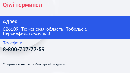 Qiwi, терминал по адресу 626109, Тюменская область, Тобольск, Верхнефилатовская, 3 в дальнейшем Организация, размещена в следующих категориях:
