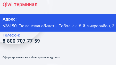 Qiwi, терминал по адресу 626150, Тюменская область, Тобольск, 8-й микрорайон, 2 в дальнейшем Организация, размещена в следующих категориях: