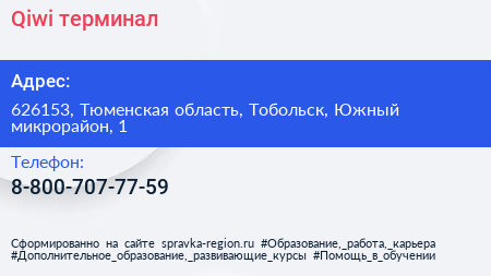 Qiwi, терминал по адресу 626153, Тюменская область, Тобольск, Южный микрорайон, 1 в дальнейшем Организация, размещена в следующих категориях: