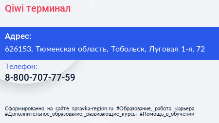 Qiwi, терминал по адресу 626153, Тюменская область, Тобольск, Луговая 1-я, 72 в дальнейшем Организация, размещена в следующих категориях:
