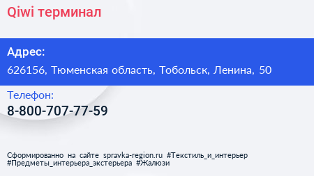 Qiwi, терминал по адресу 626156, Тюменская область, Тобольск, Ленина, 50 в дальнейшем Организация, размещена в следующих категориях: