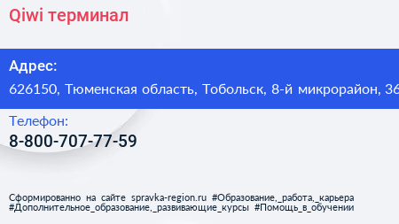 Qiwi, терминал по адресу 626150, Тюменская область, Тобольск, 8-й микрорайон, 36 в дальнейшем Организация, размещена в следующих категориях: