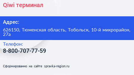 Qiwi, терминал по адресу 626150, Тюменская область, Тобольск, 10-й микрорайон, 27а в дальнейшем Организация, размещена в следующих категориях: