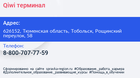 Qiwi, терминал по адресу 626152, Тюменская область, Тобольск, Рощинский переулок, 58 в дальнейшем Организация, размещена в следующих категориях: