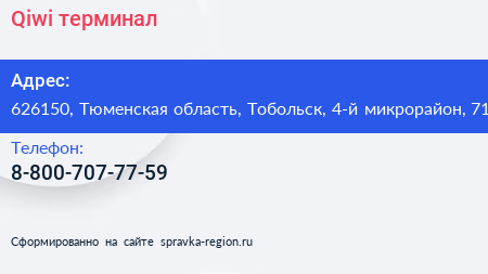 Qiwi, терминал по адресу 626150, Тюменская область, Тобольск, 4-й микрорайон, 71 в дальнейшем Организация, размещена в следующих категориях: